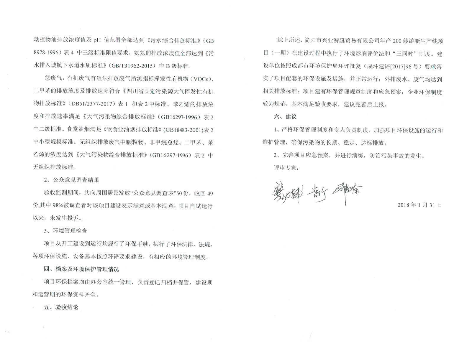3、廢氣:玻璃鋼糊制區(qū)進行密封,設有機廢氣處理間,玻璃鋼制作區(qū)產(chǎn)生的揮發(fā)性有機廢氣經(jīng)集氣罩收集后引入光氧氣催化裝置處理后由15米高排氣筒排放。苯乙烯排放滿足《惡臭污染物排放標準》(GB14554-93)二級標準;vocs、二甲苯排放滿足《大氣污染物綜合排放標準》(GB16279-1996)表中的二級標準(vocs參考執(zhí)行非甲烷總烴排放標準)。